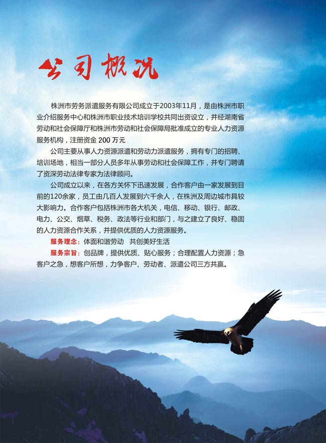 服務宗旨:創(chuàng)品牌,提供優(yōu)質、貼心服務;合理配置人力資源;急客戶之急,想客戶所想,力爭客戶、勞動者、派遣公司三方共贏。